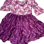 The image shows a purple frock, currently on sale for ₹399.00 (originally ₹599.00). The dress features a floral patterned top with three-quarter bell sleeves and a layered, ruffled skirt. The top part of the frock has a white base with purple floral prints, while the skirt is a solid, shiny purple with multiple ruffled layers. The dress appears to be made of a lightweight fabric, suitable for casual wear.