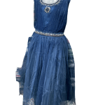 The dress is a blue frock, likely intended for a child or young girl, and is currently on sale. The top portion is a dark, shimmering blue, possibly velvet or a similar material, adorned with a beaded neckline and a decorative jewel at the center. A thin, beaded belt-like detail separates the top from the skirt. The skirt transitions from a darker blue at the waist to a lighter, almost translucent blue at the hem, giving an ombre effect. The skirt appears to have multiple layers, adding volume and a flowing appearance. The original price of the frock is ₹899.00, but it is currently on sale for ₹599.00. The dress is displayed on a mannequin, set against a plain, light background.