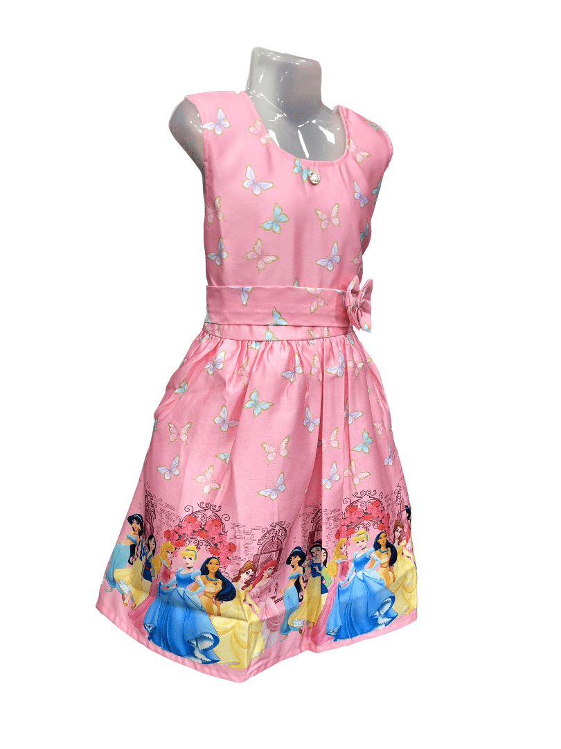 The image shows a pink girl’s dress, likely a frock, featuring a print of Disney princesses at the hem and butterfly patterns throughout. The dress has a round neckline, is sleeveless, and includes a sash at the waist with a bow detail. The skirt of the dress is gathered, giving it a slightly flared shape. The print at the bottom of the dress depicts several Disney princesses, including Cinderella, Belle, and Snow White. The fabric appears lightweight, suitable for children’s wear, and the overall design suggests it is intended for casual or semi-formal occasions.