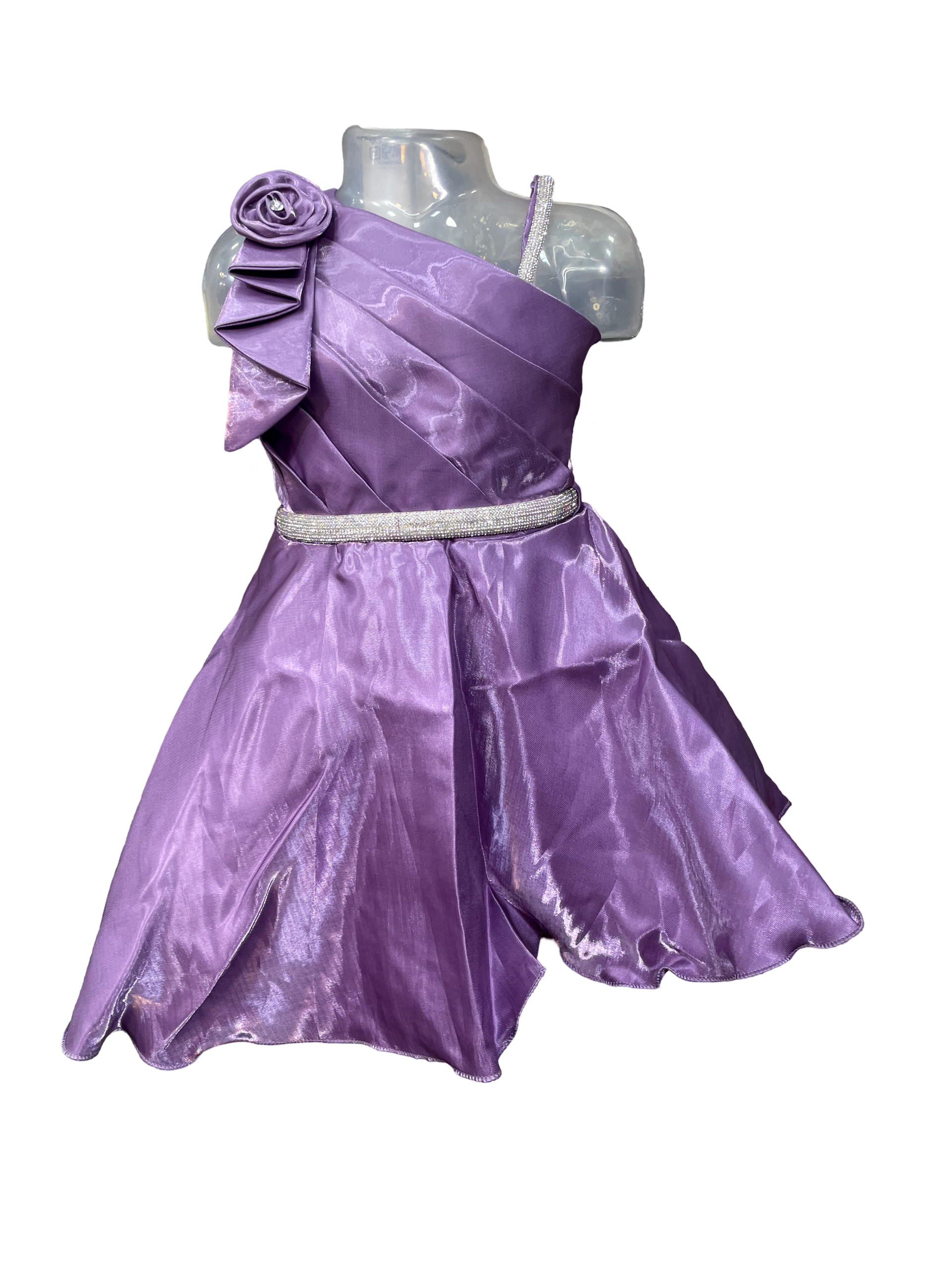 The image shows a purple dress designed for girls aged 1 to 3 years. It features a one-shoulder design with a ruffled detail and a flower embellishment on the shoulder strap. The dress has a fitted bodice with a silver belt and a layered, asymmetrical skirt. The fabric appears to be a shiny, lightweight material, possibly satin or a similar synthetic blend, suitable for party or special occasion wear. The dress is displayed on a mannequin, suggesting it is a product image for retail purposes.