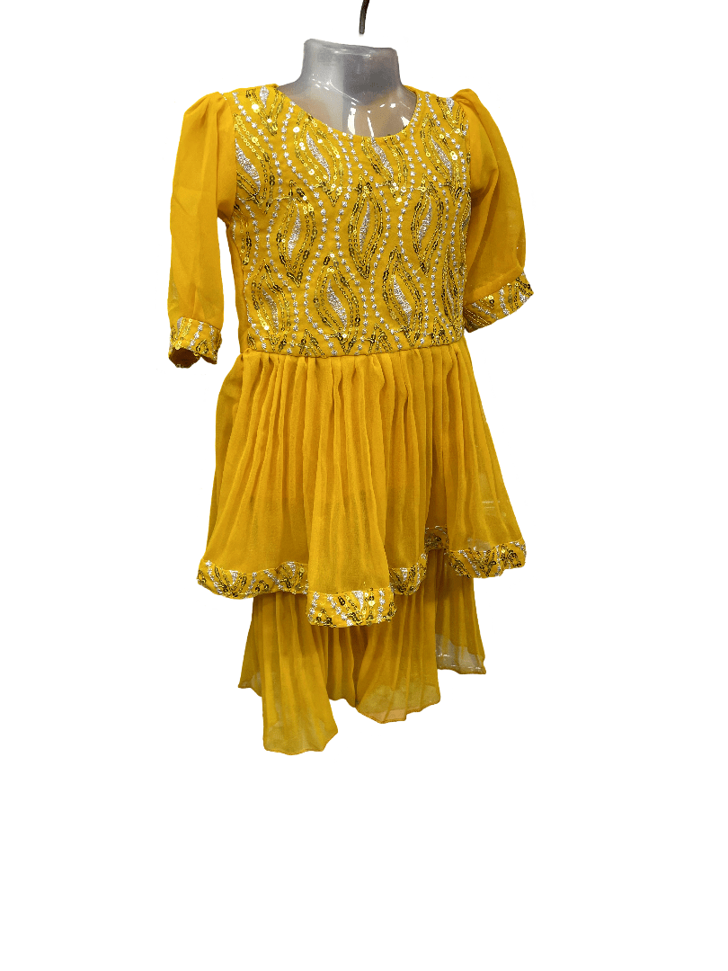 The image shows a yellow kids’ sharara suit, likely for girls aged 3 to 4 years. The top part of the dress features a round neckline and short, puffed sleeves. It is adorned with silver sequin embellishments in a paisley-like pattern on the chest area. The lower part of the top is gathered, creating a peplum effect. The bottom part of the dress consists of layered, flowing fabric, with a scalloped, sequined trim at the hem. The dress appears to be made of a lightweight, possibly chiffon or georgette, material.