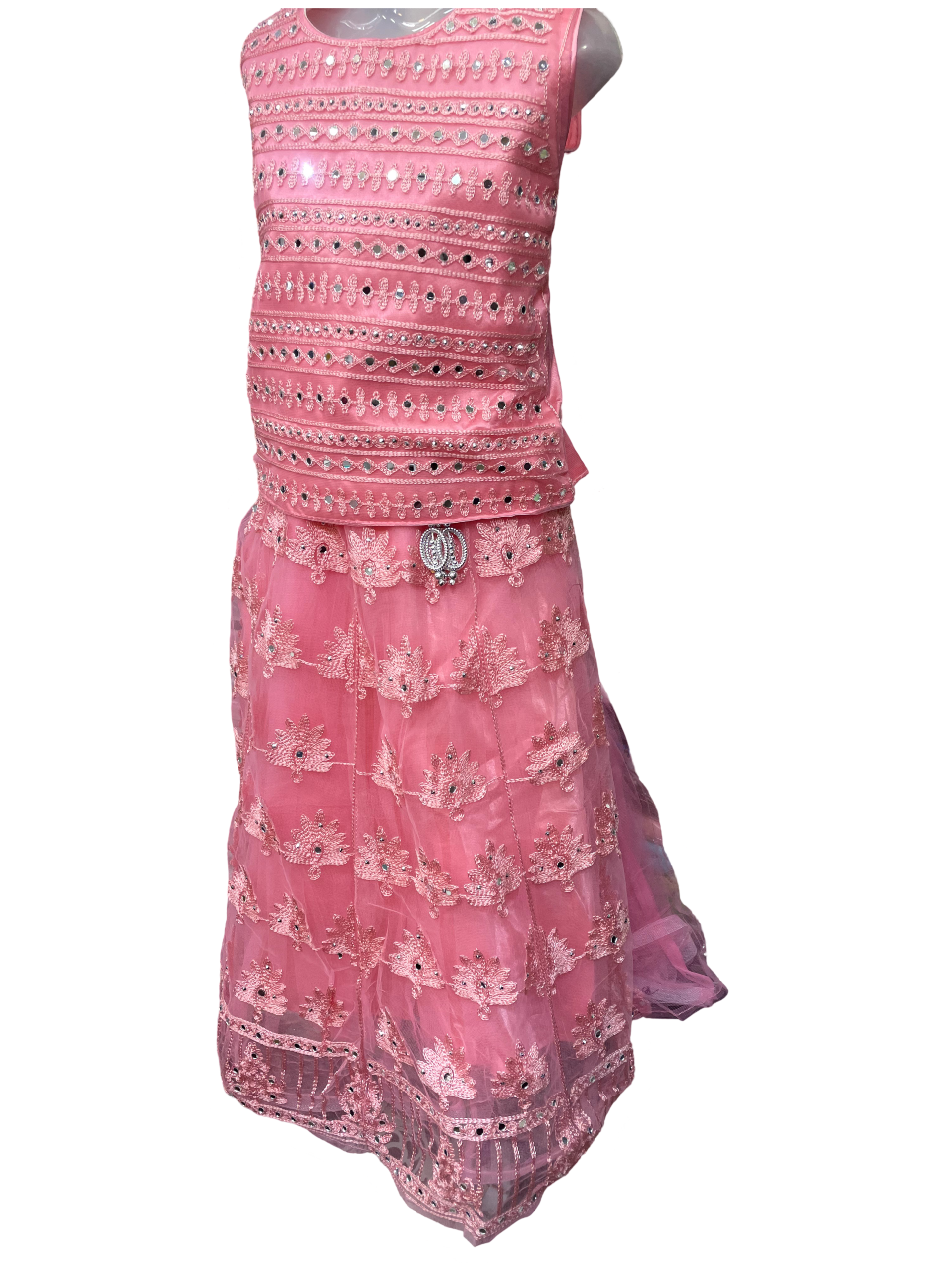 The image shows a pink lehenga choli, a traditional Indian outfit. The choli (blouse) is short-sleeved with sheer sleeves and features intricate embroidery and mirror work. The lehenga (skirt) is flared and made of a net fabric with floral embroidery and mirror detailing, and it has a satin lining underneath. The outfit also includes a decorative tassel hanging from the skirt’s waistband. This type of attire is often worn for festive occasions, weddings, and celebrations.