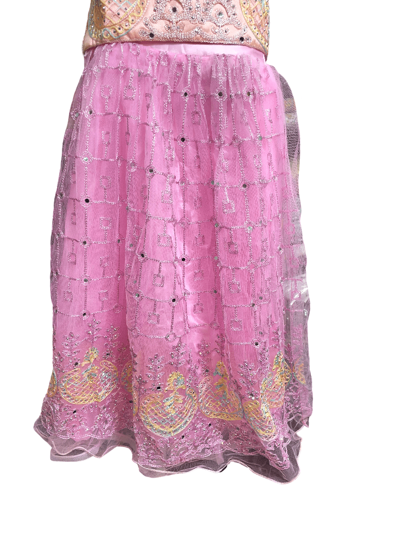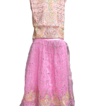 This dress features a sleeveless, light purple top adorned with intricate floral and geometric patterns in blue, pink, and gold around the neckline and upper chest. A band of gold and brown embellishments encircles the midriff. The skirt is a lighter shade of purple, made of a semi-sheer fabric with subtle shimmering accents, extending to about knee-length with a scalloped hem. The dress appears to be designed for formal or festive occasions.