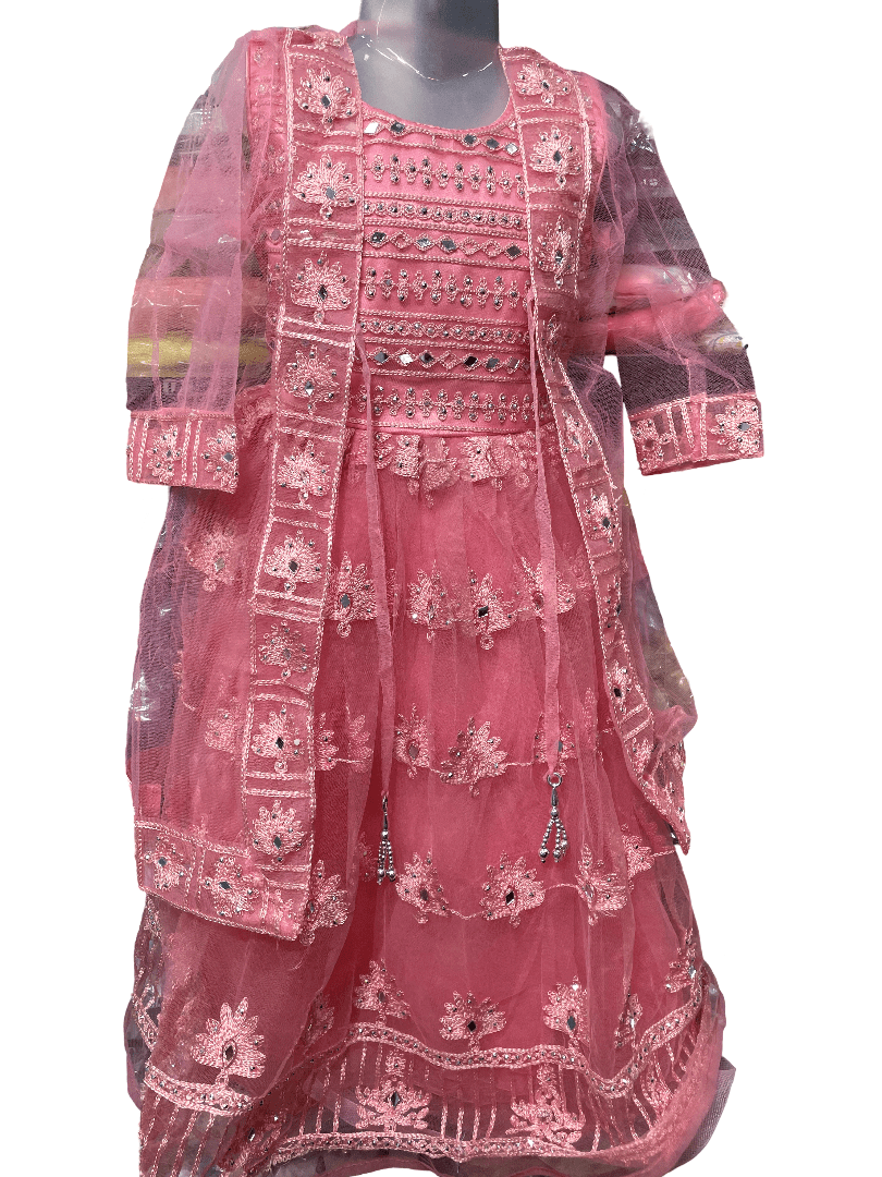 The dress in the image is described as a “Lehenga” and is currently on sale for ₹799.00, down from its original price of ₹1,399.00. A lehenga is a traditional Indian garment, typically worn for weddings and other festive occasions. It consists of a long, skirt-like bottom (the lehenga itself), a blouse (choli), and a dupatta (a scarf or shawl). The lehenga in the image appears to be a three-piece set, featuring intricate embroidery and embellishments. The color is a light purplish-pink, and the fabric seems to be lightweight and possibly sheer, given the layered effect and visible texture. The design includes a heavily embroidered bodice and sleeves, with tiered layers on the skirt, each adorned with a different pattern. The embroidery appears to be a mix of geometric and floral motifs, adding to the garment’s traditional aesthetic.