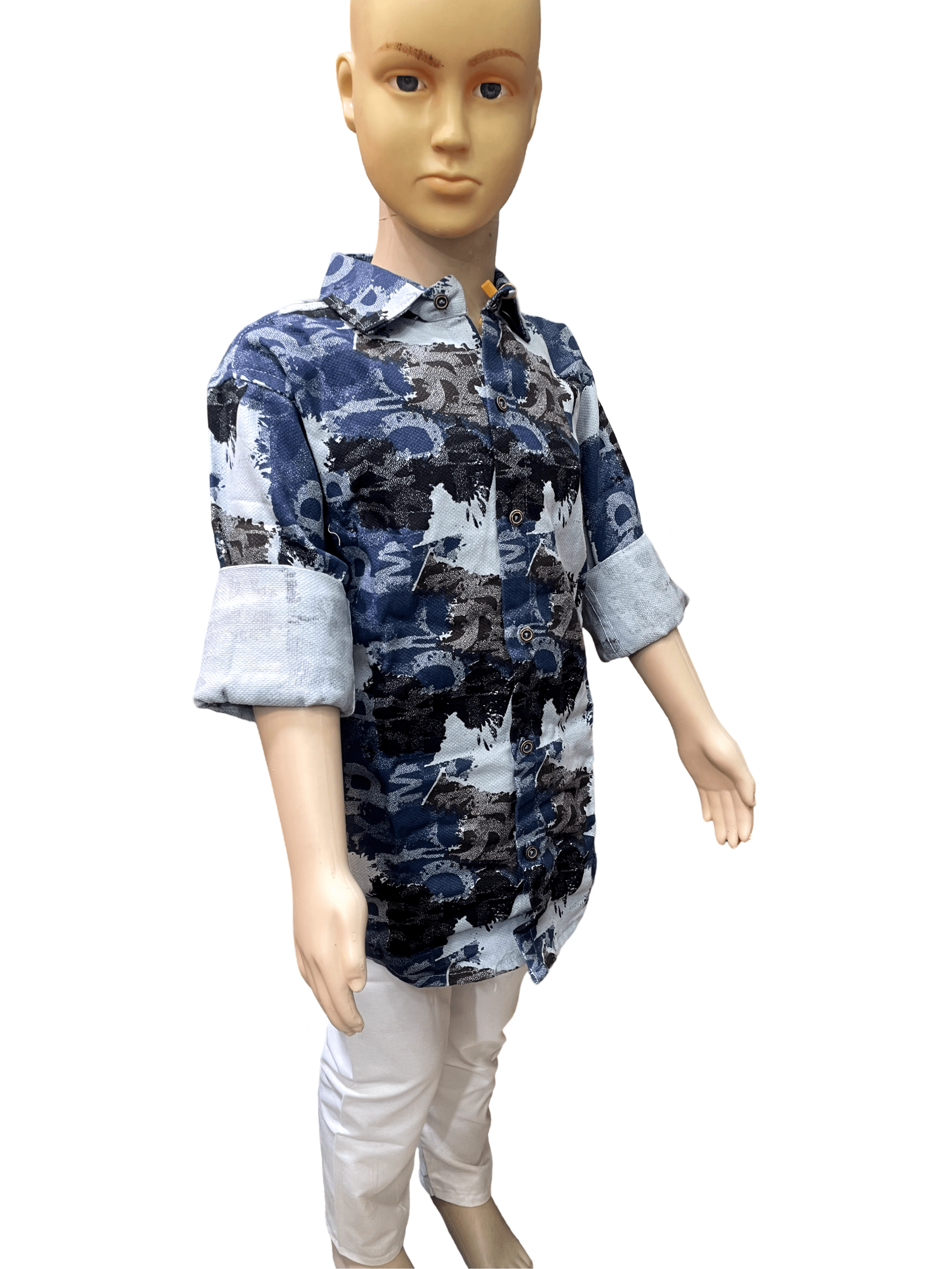 The image shows a mannequin wearing a boy’s long-sleeved shirt. The shirt features a blue, gray, and white abstract pattern, resembling a mix of camouflage and tie-dye designs. It has a classic collar, button-down front, and cuffed sleeves. The fabric appears to be lightweight, possibly cotton or a cotton blend, suitable for casual wear. The shirt is designed with a regular fit, and the pattern gives it a modern, stylish look. It could be described as a fashionable and comfortable piece for a child’s wardrobe.