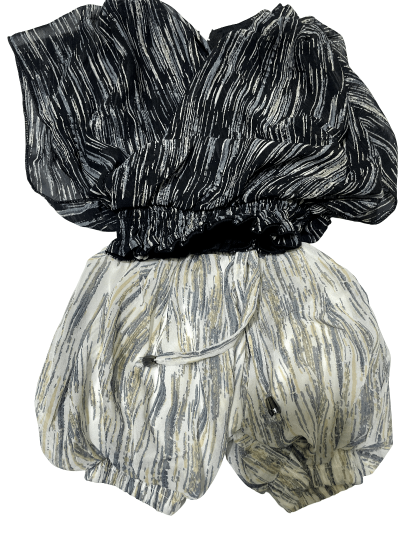 The garment appears to be a two-piece set or a romper-style outfit, featuring a dark, possibly black or navy, textured top and light-colored, striped shorts. The top seems to have a gathered or elasticated waist, creating a blouson effect, while the shorts are loose-fitting, resembling bloomers or boxer shorts. The fabric of both pieces has a subtle, wavy stripe pattern, possibly indicating a lightweight material suitable for warmer weather. The overall style suggests a casual, comfortable, and perhaps bohemian aesthetic. There is also a “Sale” tag in the upper left corner of the image.